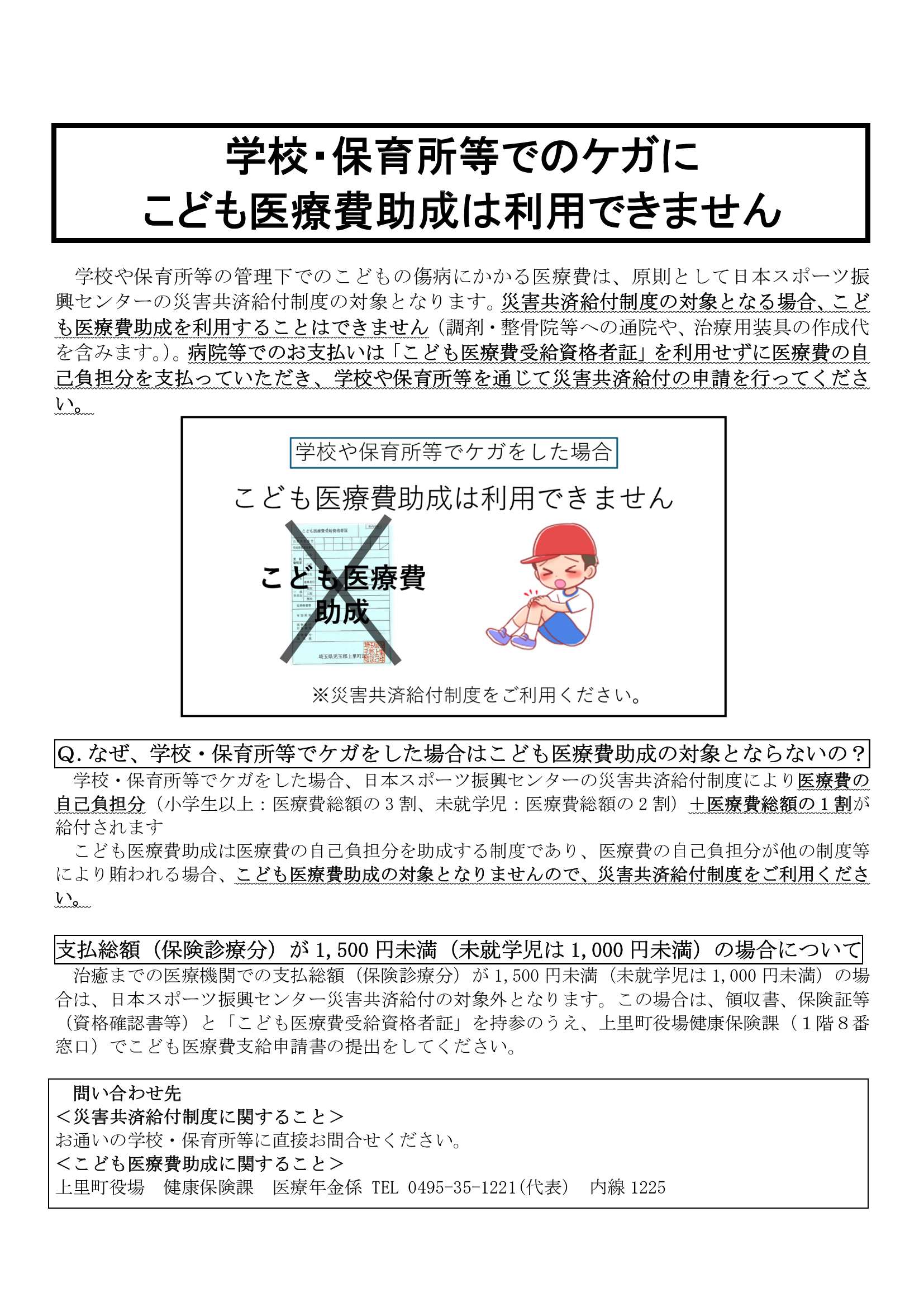 治癒までの医療機関での支払総額(保険診療分)が1,500円未満(未就学児は1,000円未満)の場合は、日本スポーツ振興センター災害共済給付の対象外となります。この場合は、領収書、保険証等(資格確認書等)と「こども医療費受給資格者証」を持参のうえ、上里町役場健康保険課(1階8番窓口)でこども医療費支給申請書の提出をしてください。