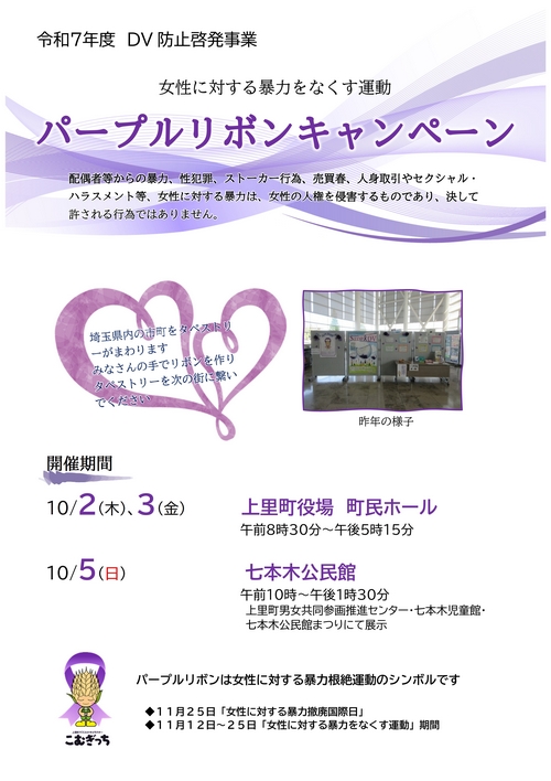 埼玉県男女共同参画推進センター(WithYouさいたま)では、「女性に対する暴力をなくす運動」を多くの方々に啓発するため、大きなタペストリーのポケットにパープルリボン入れ、県内の市町をリレー方式でつなぐイベントを展開しています。上里町もこの趣旨に賛同し、パープルリボンキャンペーンを実施します。