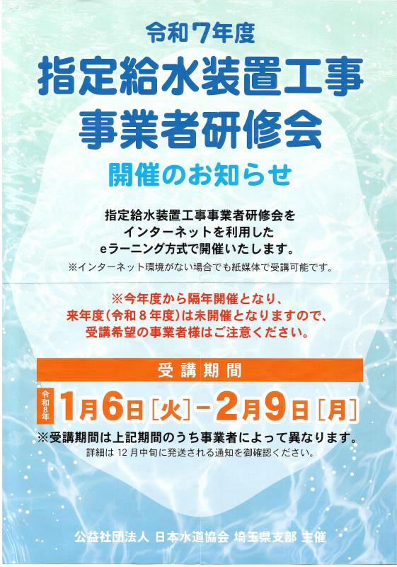 令和7年度指定給水装置工事事業者研修会開催のお知らせ(公益社団法人 日本水道協会 埼玉県支部主催)