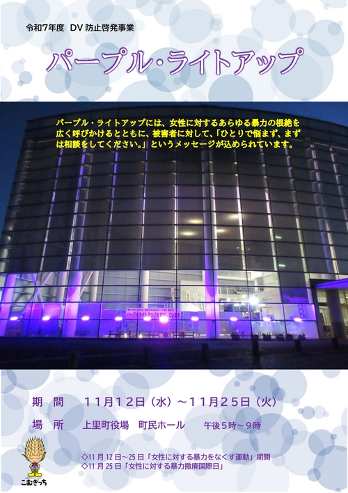 毎年、11月12日から11月25日は「女性に対する暴力をなくす運動」期間です。この運動期間に合わせ、相談窓口カードの配布やパープル・ライトアップを行います。